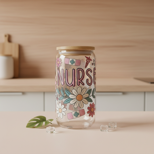 16oz Floral Penguin Glass Tumbler with Bamboo Lid